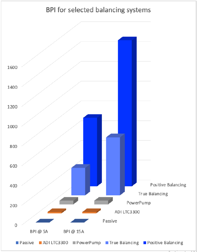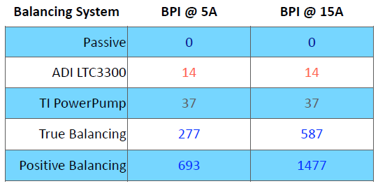The LTC3300 from Analog Devices and PowerPump from Texas Instruments are the two best commercially available active balancing technologies we have seen. This table shows how they compare to True Balancing and Positive Balancing.